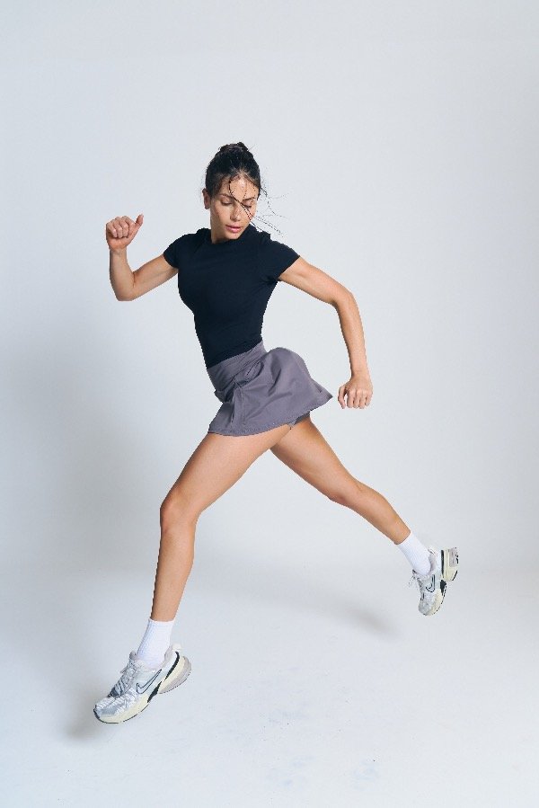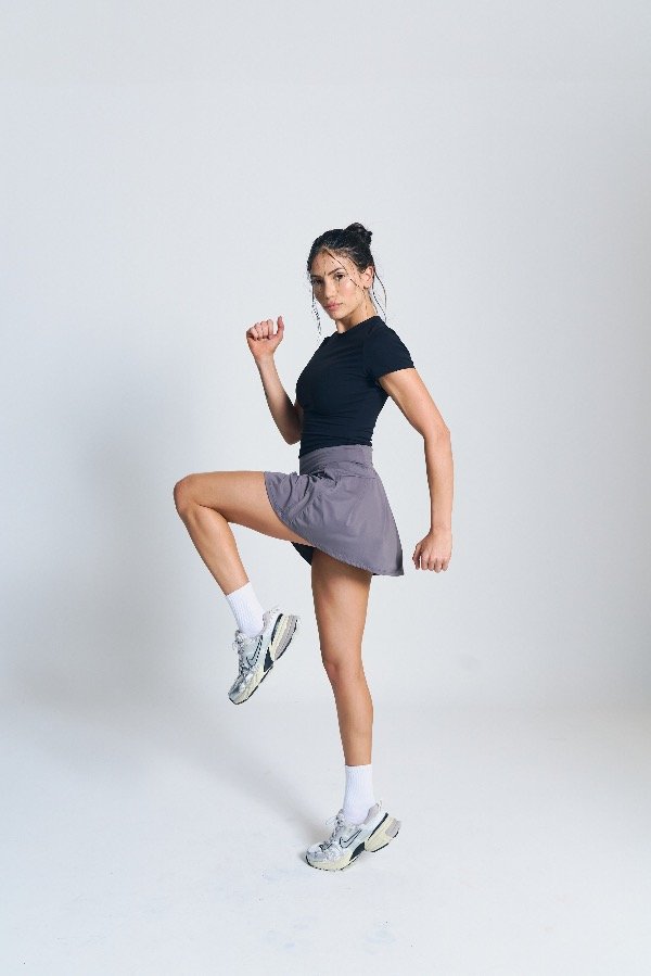MINI CON TABLAS ANCHAS, CON CALZA INTERNA Y BOLSILLO TRASERO. DE MICROFIBRA.